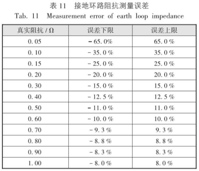 采用仪表测量接地故障环路阻抗也会有误差,如某数字仪表测试接地环路阻抗精度为:0.01 ~9.99 ( 5 %0.03 )时,其相对误差见表11。