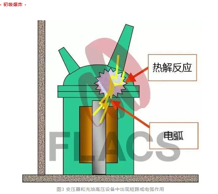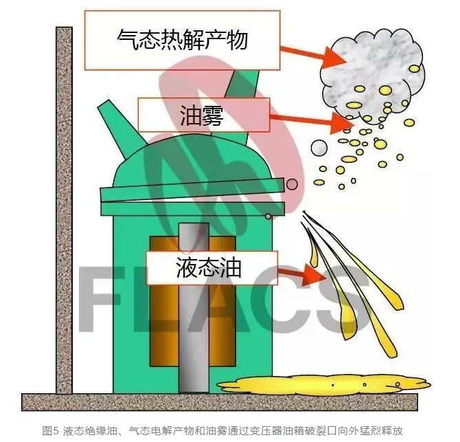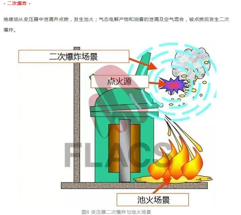 初级变压器爆炸后,绝缘油、混合气体和油雾通过变压器油箱破裂口向外猛烈释放。绝缘油从变压器中泄漏,在地面形成液池,被点燃即发生池火。而当泄漏的热解产物混合气体和油雾与空气混合后点燃,就会发生二次爆炸。当这些情况发生在密闭或拥塞区域时,可能会导致非常强烈的爆炸,并对人员和设备造成威胁,给社会经济带来严重损失。
