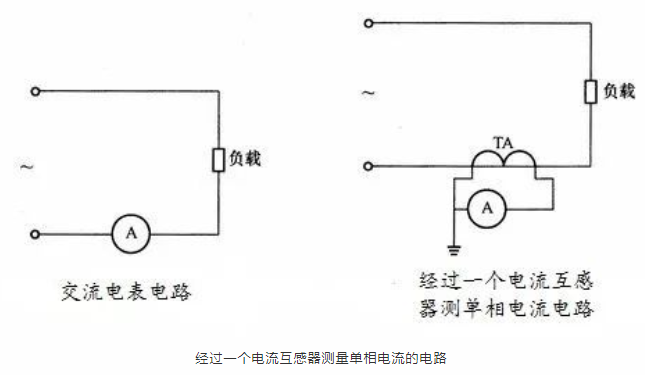 在交流电路中,如果被测电流较大,或者被测量电路的电压较高,都可以使用电流互感器和量程为5A的交流电流表测量电流,这是为了扩大电流表量程,同时也比较安全。电路的接线如下图所示,左边的是平常我们使用交流电流表的测量电路,直接串联负载进行测量,右边是需要用到电流互感器时的电流测量电路图。