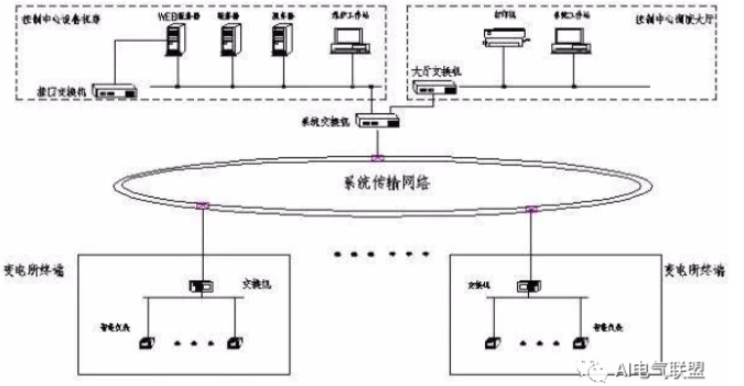 电能质量管理系统由三部分组成:控制中心的电能质量管理系统,各变电所被控站的终端信息通信装置,以及连接两者的通信通道。