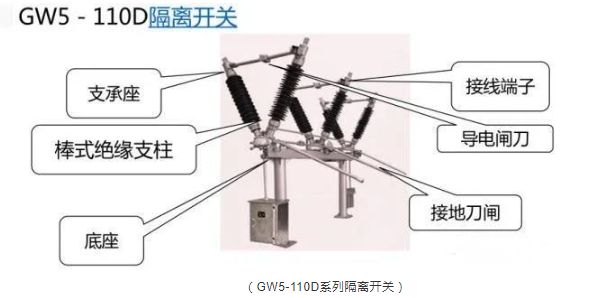 开关由底座、棒式支柱绝缘子、导电闸刀、左右触头和传动部分等组成,也称为V型隔离开关。根据需要该隔离开关可配装接地闸刀,广泛用于35~110kV电压等级中。