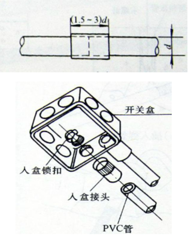 线管入盒必须顺直,不得斜插入内;套筒长度为管径的1.5~3倍;线管套筒粘接时粘接剂必须涂满管壁及端部,管的端部必须紧密连接并保持至少15不动,保证粘接牢固,线管接头及两端50mm处必须固定牢固。