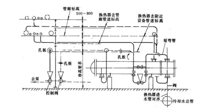 配管时管道要尽量短,操作、维修要方便。在管廊上有转弯的管道布置在换热器的右侧,从换热器底部引出的管道也从右侧转弯向上。从管廊的总管引来的公用工程管道,可以布置在换热器的任何一侧。将管箱上的冷却水进口排齐,并将其布置在冷却水地下总管的上方,回水管布置在冷却水总管的管边。换热器与邻近设备间可用管道直接架空连接。管箱上下的连接管道要及早转弯,并设置一短弯管,便于管箱的拆卸。