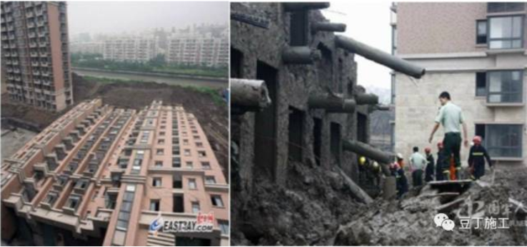 为便于土方回填及绿化用土,地下车库开挖出的土方堆放在所倒塌楼北侧等处,短期内堆高最高达10米。于此同时,紧邻大楼南侧的地下车库,基坑正在开挖,开挖深度4.6米,大楼两侧压力差使土体发生水平位移,过大的水平力超过桩基的抗侧能力,导致房屋倾倒。