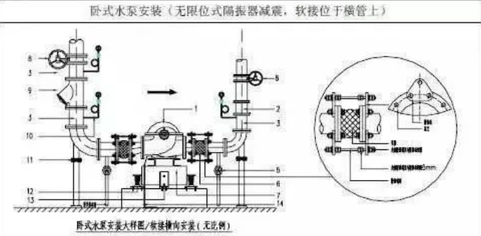 6.水泵水平管段上当软接安装空间距离不够时将软接在立管上安装,并采用不同的减震方式。