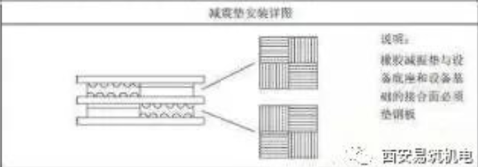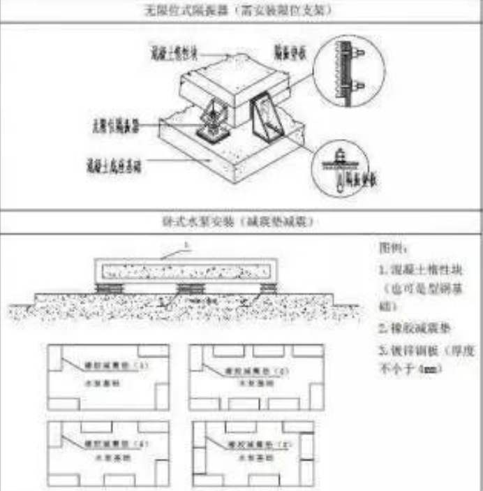 1.弹簧减震适用于隔振要求比较高的场所,减震垫减震适用于一般场所;当机房设置于楼层内时,应设置浮筑基础。