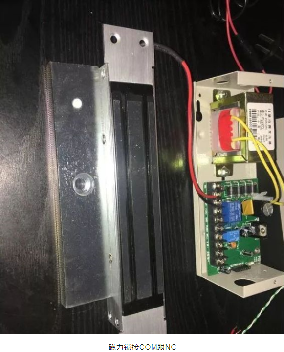 大家会看到有10个接线端子,NO跟COM接电控锁的,NC跟COM接磁力锁,12V跟GND给门禁一体机供电,GND跟PUSH接开门信号,接开门按钮都可以。后面是接门铃对讲,蓄电池的,我一般都不用,所以不讲了。下面先接磁力锁,磁力锁就红黑两根线,如下图