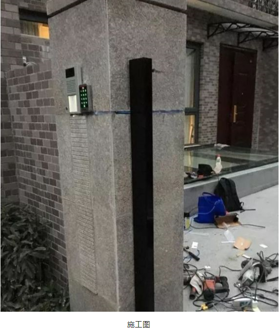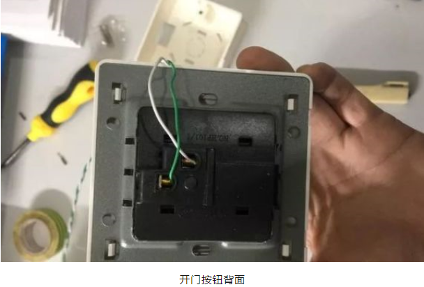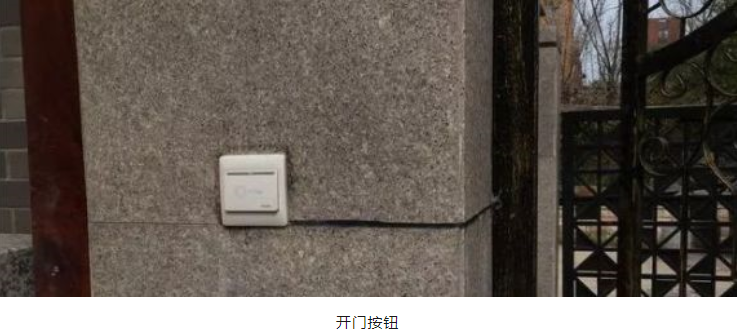 这就接完了,编程这里就不说了,说明书都有,客户回家刷卡或密码开门,或者按门铃家里人也可以从室内门铃上按开门键开门。出来的话直接按开门按钮门就开了。