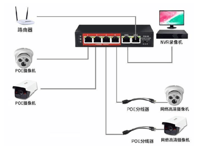 2. 风险过于集中:通常来说,一台PoE交换机同时会给多个前端IPC进行供电,交换机的POE供电模块任何故障都会导致所有的摄像机无法工作,风险过于集中。