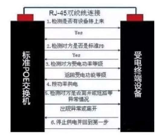 总结来说,标准的PoE供电交换机内部有PoE控制芯片,在供电之前有检测的功能,当设备连接好后,PoE供电器会向网络中发送一个信号,检测网络中的终端是否是支持PoE供电的PD设备。而非标准PoE产品是强供型网线供电装置,一通电即供电,没有检测步骤,不管终端是否是PoE受电设备都供电,极易烧毁接入设备。