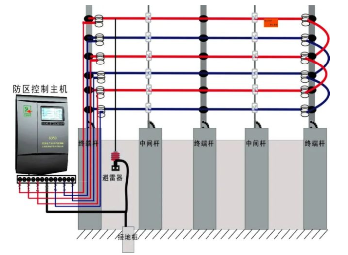 电子围栏主机输出端产生高压脉冲并传输到前端围栏上,形成回路的前端围栏将脉冲回传到主机接收端,如果有人穿越(短路)、剪断(断路)前端围栏或破坏主机,主机会产生报警信号,并把报警信号同时传给现场的报警器和监控中心。