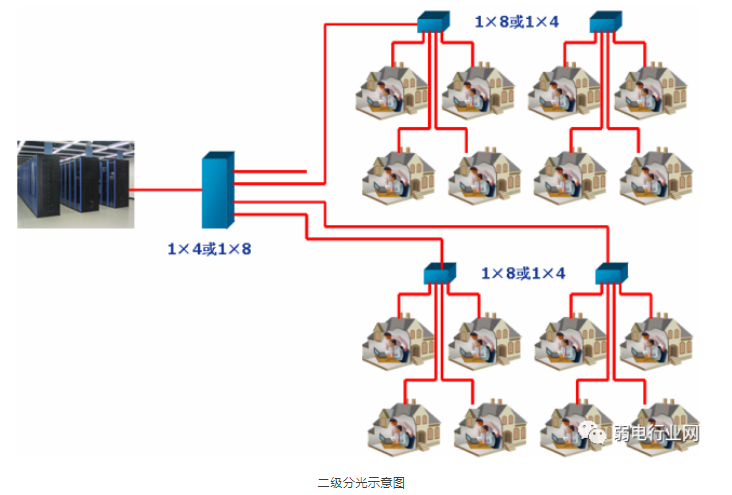 如果采用二级分光,因配置问题,PON 的利用率会不均衡,整体来说,小区总的 PON 口需求会超过 8 个,这种情况下,必须增加 OLT 设备才能满足需求,随着 OLT 的增加,机房设备、干线光缆、入户光缆、光纤配线箱等等全部需要增加,导致整体投资上升。