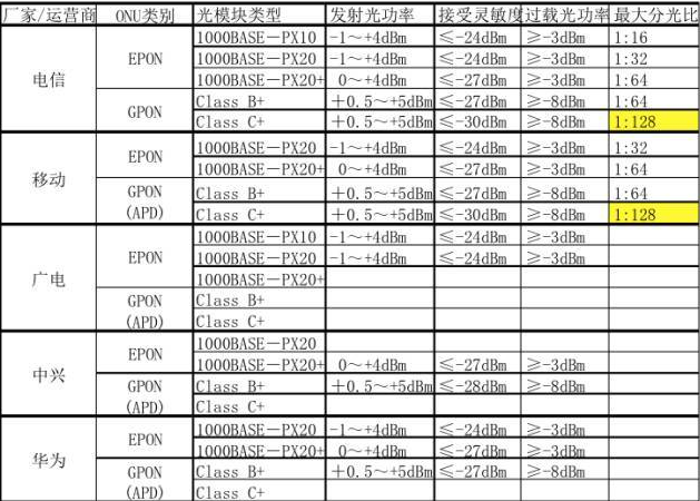 -1000BASE-PX20+,允许通道插损28dB,支持最高光分路比为1:64,当前采购EPON设备均配置PX20+光模块。