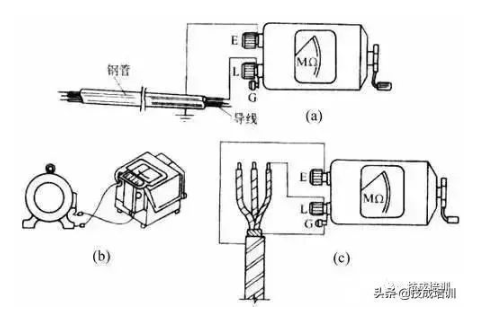 测量电缆的导电线芯与电缆外壳的绝缘电阻时,将接线柱E与电缆外壳相连接,接线柱L与线芯连接,同时将接线柱G与电缆壳、芯之间的绝缘层相连接,如上图c所示。