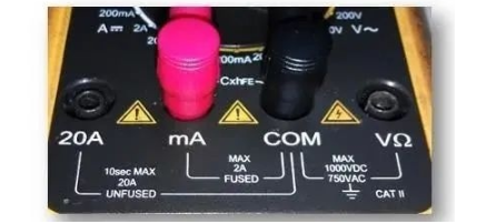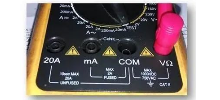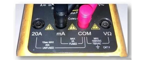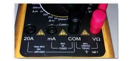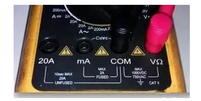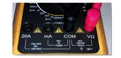 (1)将黑表笔插入COM插孔,红表笔插入mA插孔中(最大为2A),或红表笔插入20A中(最大为20A);(如图8所示)