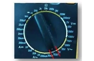 (2)将量程开关置于TEST档位上,将红色表笔接在被测线路上;(如图19所示)