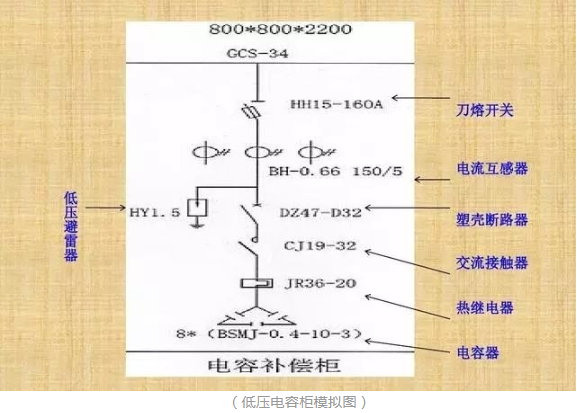 上面是一张普通的低压电容柜模拟图。从图中我们可以看到低压电容柜是并联在低压母线上的。图中的低压电容柜有8组补偿电容。
