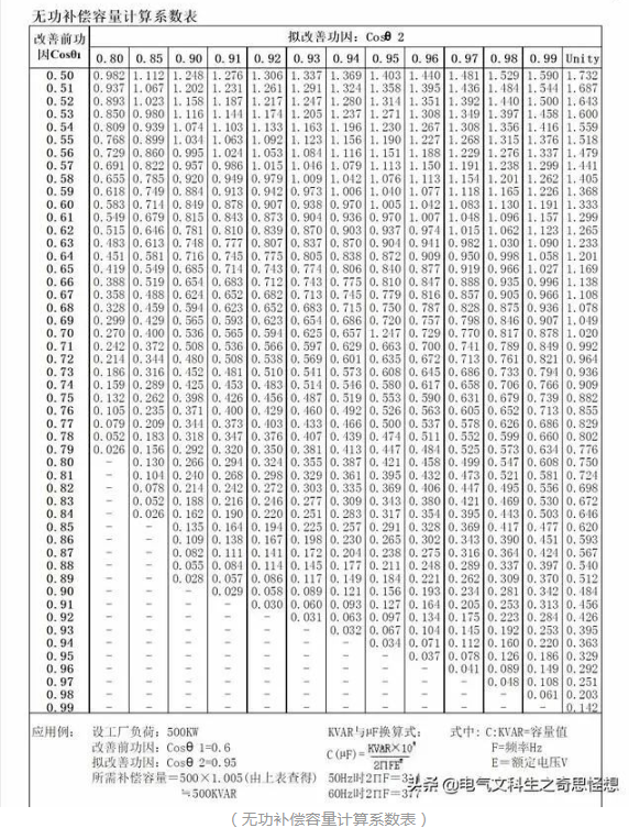 2.查询无功补偿容量计算系数表,根据补偿前后找到相应的系数F。如补偿前为0.6,补偿后想达到0.95,可以查得系数F=1.005