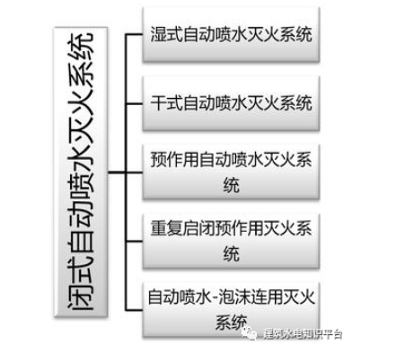 自动喷水灭火系统分类:闭式自动喷水灭火系统、开式自动喷水灭火系统
