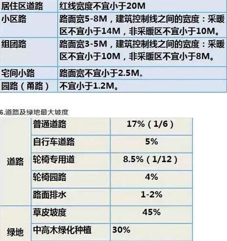 居住区道路最大纵坡不应大于8%;园路不应大于4%;自行车专用道路最大纵坡控制在5%以内;轮椅坡道一般为6%;最大不超过8.5%,并采用防滑路面;人行道纵坡不宜大于2.5%。