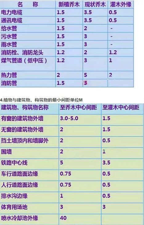 3.植物与地下管线的距离要求(指外沿到乔灌木中心距离单位M)