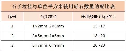 (1)注意水洗石的大小及单位平方米的含量配比,可参照以下表格: