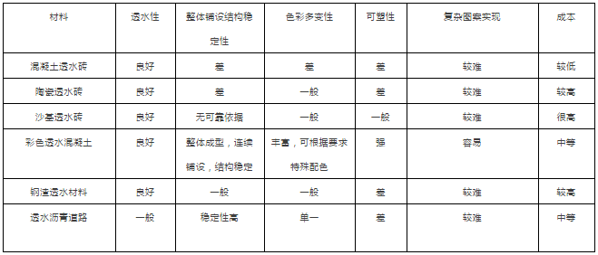 目前常用的透水材料主要有透水砖类、透水混凝土、透水沥青、碎石地面、糠粮砂等,这些材料的都具有一定的透水性,但性能各不相同,以下是常用透水铺装材料性能的比较: