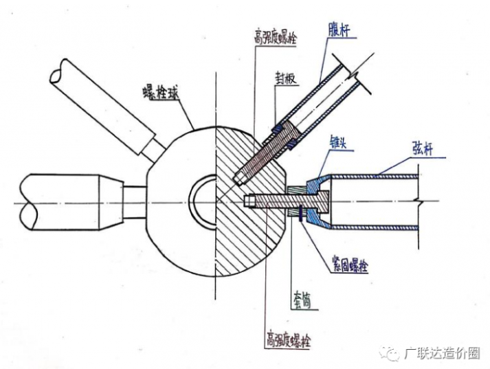 杆件长度= (杆件几何长度)(一段球半径+另一段球半径+一段套筒长度+另一段套筒长度+一个锥头长度+另一个锥头长度+一边封板的厚度+另一边封板的厚度)+(一段螺栓球切削量)+(另一段螺栓球切削量)