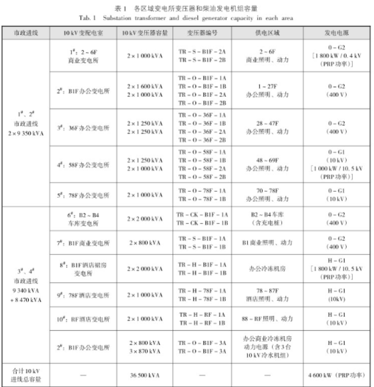各区域变电所变压器和柴油发电机组容量如表1所示。