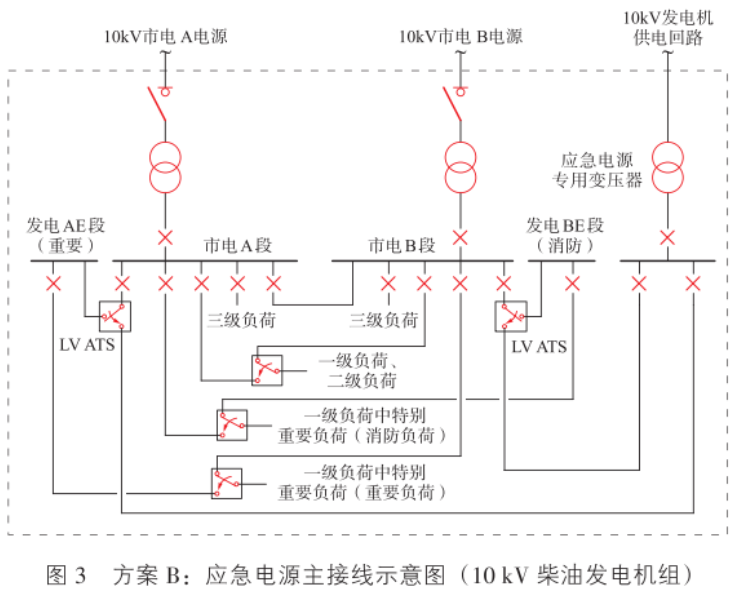 b.方案B(如图3所示),对于个别地区电业部门不允许10 kV柴油发电机与市电进行切换,就必须考虑设置应急电源专用变压器,此种方案下,应急变压器出口端同样将消防回路和重要负荷回路区分开,分别接入消防母线段和重要负荷母线段,这个方案的缺点是专用应急电源变压器会占据较大机房位置,平时不用,如果不通电难以确保停电时的可靠性,如果平时通电则长期空载运行,并不节能。另外从10 kV柴油发电机出口端这个10 kV回路并未将消防和重要负荷分开,严格意义上与《加强性技术要求》并不完全一致。如果10 kV柴油发电机出口就分开消防和重要负荷的回路,电缆造价增加的同时,应急专用变压器也要分设,会占据更大机房面积和增加造价,经济性较差,不建议采用。