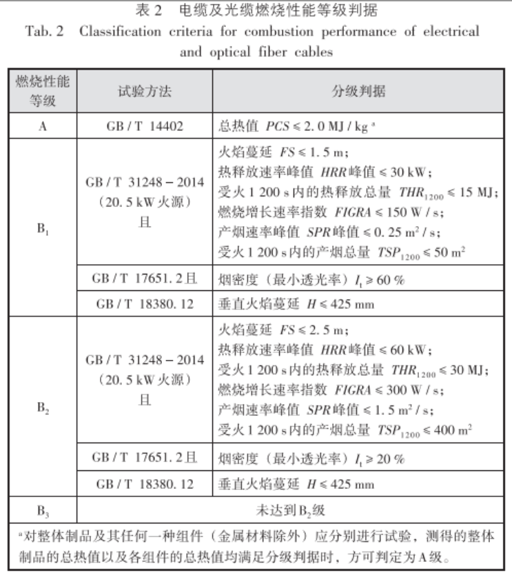 这里要注意的是建筑高度大于250 m的超高层建筑,其消防电缆可以有两种要求,其中消防电梯和辅助疏散电梯的供电电缆要求最高,燃烧性能为A级,对于其他消防供配电电线电缆可以放宽到B1级,但耐火时间都是不小于3.0 h,且其燃烧性能分级都是依据《电缆及光缆燃烧性能分级》GB 31247的规定。这里尤其要注意的,这个燃烧性能B1级与我们平时经常说的低烟无卤阻燃B级,参照标准和含义完全不同。通常我们说的低烟无卤阻燃级别A / B / C / D等,源自GB / T 18380《电缆和光缆在火焰条件下的燃烧试验》系列标准,最早见诸设计规范是上海地标DGJ 08 - 93- 2002《民用建筑电线电缆防火设计规程》(已作废),以及其后续版本DG / TJ 08 - 2048 - 2008《民用建筑电气防火设计规程》(已作废),分别依据的是GB / T 18380.1 ~ 3 - 2001《电缆在火焰条件下的燃烧试验》(已作废)和GB / T 18380 - 2008两个版本,其源头都是IEC 60332 - 3:2000《电缆在火焰条件下的燃烧试验》。主要都是在不同的火焰燃烧条件下(其中A、B级是相同的40 min,C、D级是相同的20 min),同等的焦化高度和自熄时间情况下,阻燃级别更高的电缆,非金属含量多的电缆也能达到同等的焦化高度和自熄时间,实际上就允许敷设更多的高阻燃级别的电缆。而GB 31247 - 2014《电缆和光缆燃烧性能分级》则是一本完全国产的规范,由公安部提出,公安部XX消防研究所负责起草,主要就是针对火灾情况下电缆和光缆的燃烧性能进行的分级,其燃烧性能等级判据如表2所示。