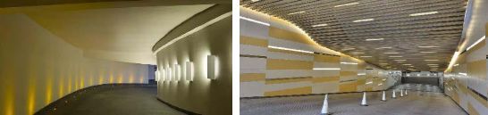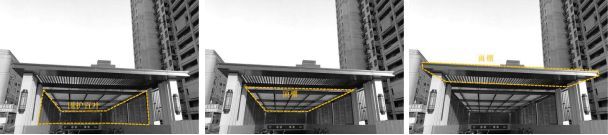 地库门头设置雨棚、顶棚与围护百叶,设置格栅可以缓冲进入地库时的光环境变化,雨棚与顶棚可以避免雨水倒灌。围护百叶隔雨而通风,确保尾气排出。
