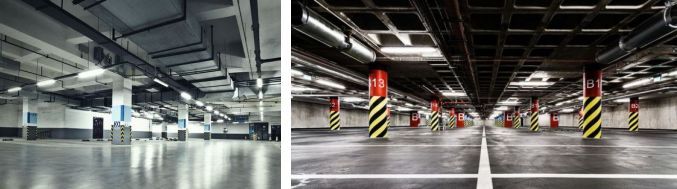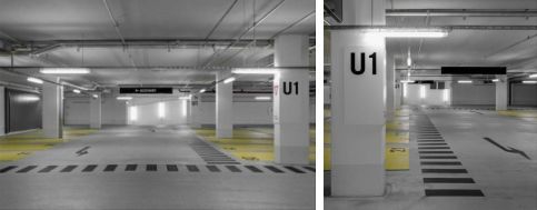 大型地库要以颜色区分停车区,每个颜色代表200-250个车位,主要以墙面和柱面颜色分区,相邻分区颜色应有明显色差。