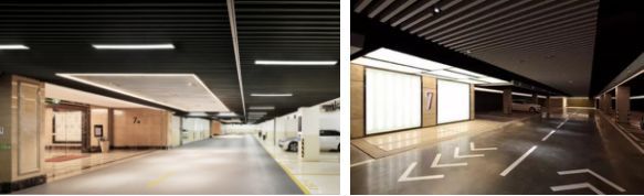 地库导视系统主要由吊顶部位的车行导视牌与地面部位的车行划线共同构成。高端住宅还可以配置停车导向系统,感应系统感知车行方向,结合线上手机APP指引车辆进入所属的停车位,线上线下双指引。