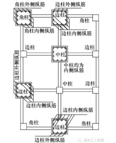 答:一般用柱上支撑的梁的相交形式来判断,梁与梁L型相交的柱一般是角柱,梁与梁T型相交的柱是边柱,十字相交的柱子一般是中柱。判断每个柱子钢筋属于外侧还是内侧,见下图。