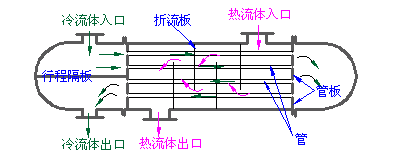 进行换热的冷热两种流体,一种在管内流动,称为管程流体;另一种在管外流动,称为壳程流体。为提高管外流体的传热分系数,通常在壳体内安装若干挡板。