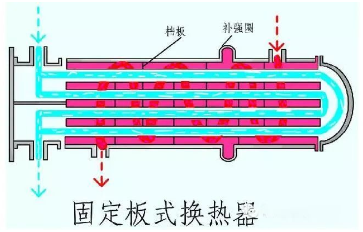 因此,当管束与壳体温度差超过50℃时,需采取适当补偿措施,以消除或减少热应力。根据所采用的补偿措施,管壳式换热器可分为以下几种主要类型: