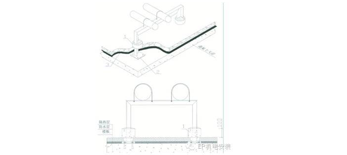 支架掌板必须在天面防水层施工前固定在混凝土屋面上,PVC短管套在天面完成面上方,内填水泥砂浆,水泥墩顶层表面需有5% 的泄水坡度并油沥青油。