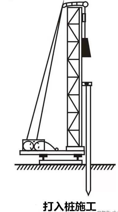 预制桩是在工厂或施工现场制成的各种形式的桩,用沉桩设备将桩打入、压入或振入土中,或有的用高压水冲沉入土中。根据沉入土中的方法,可分打入桩(锤击沉桩)、水冲沉桩、振动沉桩和静力压桩等;