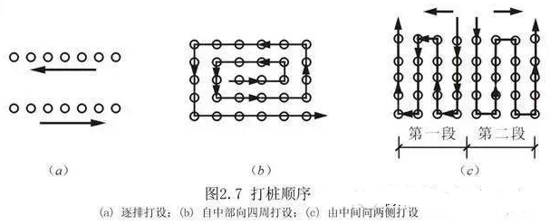 根据桩的密集程度,打桩顺序一般分为逐段打设、自中部向四周打设和由中间向两侧打设三种。