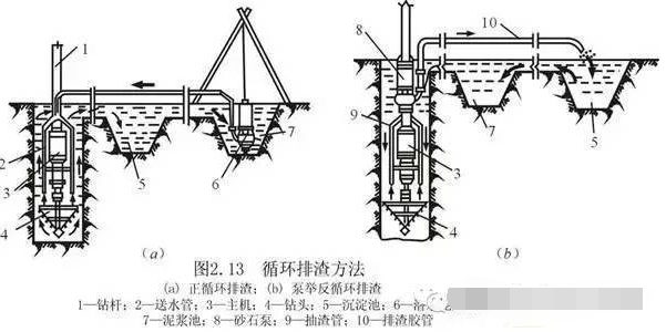 潜水钻机成孔。潜水钻机是一种旋转式钻孔机,其防水电机变速机构和钻头密封在一起,由桩架及钻杆定位后可潜入水、泥浆中钻孔。注入泥浆后通过正循环或反循环排渣法将孔内切削土粒、石渣排至孔外。