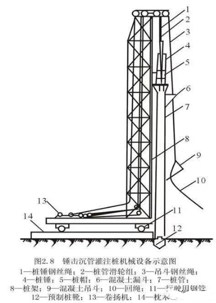 利用锤击沉桩设备沉管、拔管成桩,称为锤击沉管灌注桩;利用振动器振动沉管、拔管成桩,称为振动沉管灌注桩。