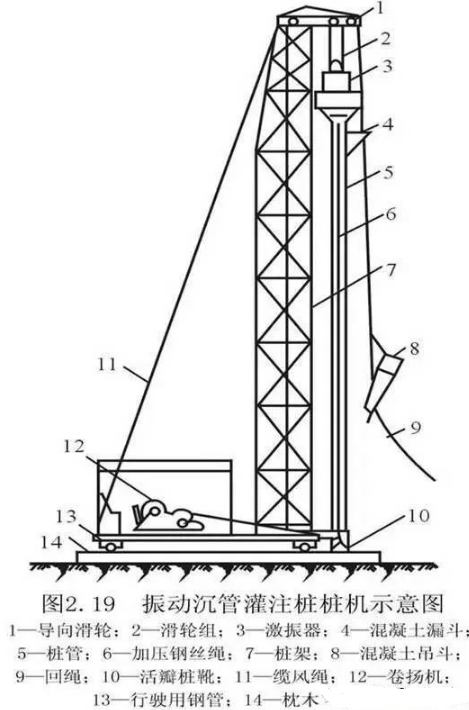 振动沉管灌注桩采用激振器或振动冲击沉管。其施工过程为:桩机就位,沉管,上料,拔管。