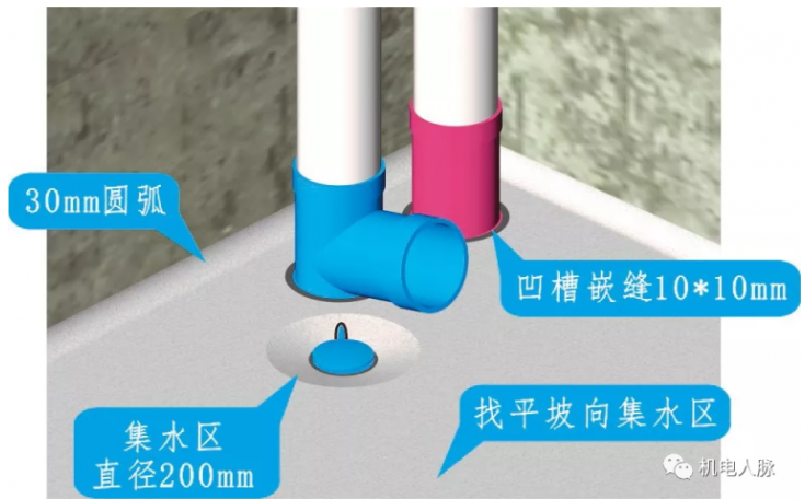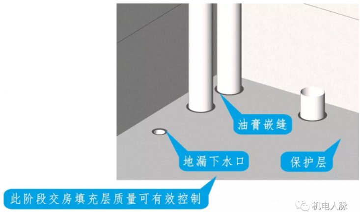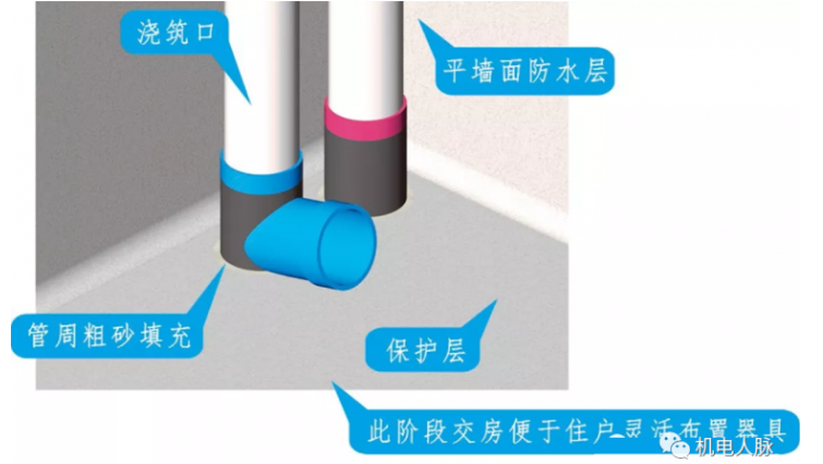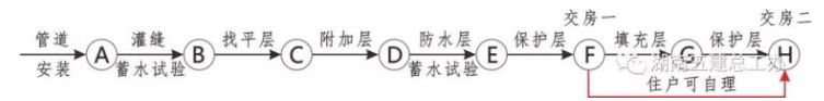 H.管周留凹槽嵌防水油膏,住户施工楼地面装饰面层前,需在保护层上再做涂膜防水层一遍,与土建防水形成复合防水层。