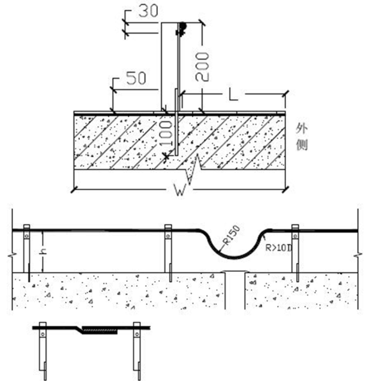 第二类防雷建筑物的高度超过45m的沿屋面周边敷设的接闪带应设在外墙外表面或屋檐边垂直面上,也可设在外墙外表面或屋檐边垂直面外,具体做法见下图。
