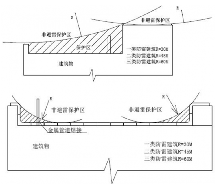 1)突出屋面的金属管道符合GB50057《建筑物防雷设计规范》的规定没有得到接闪器保护的屋顶孤立金属物的尺寸没有超过以下数值时可不要求附加的保护措施:高出屋顶平面不超过0.3m,上层表面总面积不超过1.0㎡和上层表面的长度不超过2.0m的应与防雷装置相连。详见下图保护区域描述。
