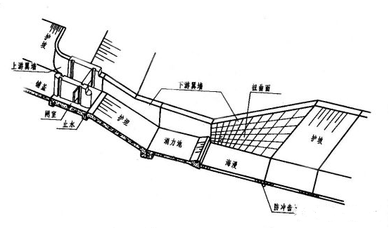 3、护坦及消力池:经闸、坝流下的水具有很大的冲击力,为防止下游河床受冲刷,保证闸、坝的安全,在紧接闸坝的下游河床上,常用钢筋混凝土做成消力池。消力池的底板称护坦,上设排水孔,用以排出闸、坝基的渗透水,降低底板所承受的渗透压力。