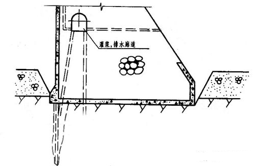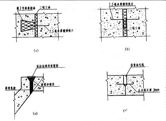 7、分缝中的止水:为防止水流的渗漏,在水工建筑物的分缝中应设置止水结构,其材料一般为金属止水片、油毛毡、沥青、麻丝等。