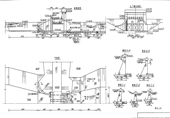 本图采用了三个基本视图(纵剖视图、平面图、上、下游立视图)及五个断面图。