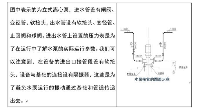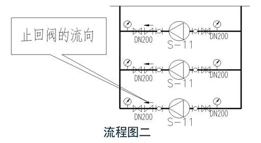 泵组在流程图中是比较重要的,它是流体输送的动力,下图是流程图中的冷却水泵泵组,我们可以注意到水泵进出口设置的阀门管件,压力表的设置表明水泵进出口压力的变化,而止回阀上面介质的流向则表明整个系统中介质按此方向流动,而每台泵接管管径的标注也弥补了平面图中管径无法逐段标注的遗憾。